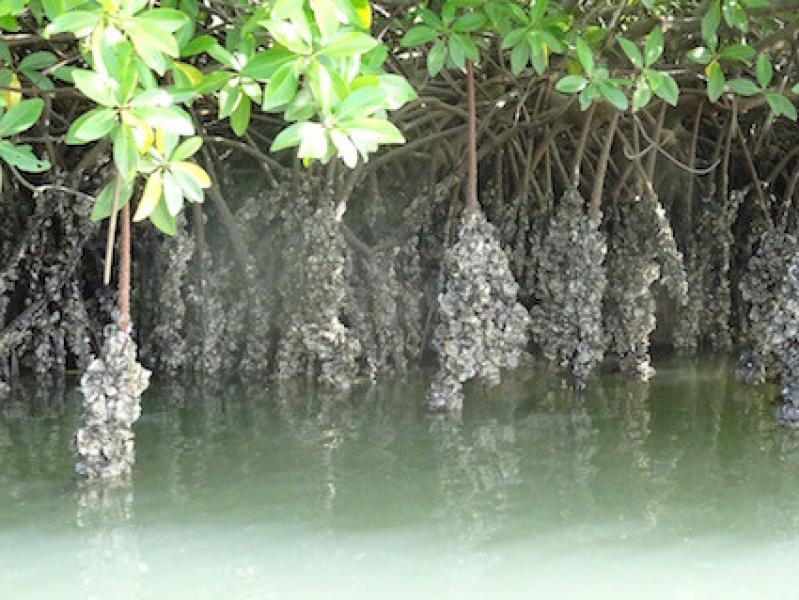 Restaurant locally built with wooden pillars in the River and surrounded by mangroves creeks and hanging around Monkeys.